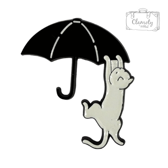 Metalowa Przypinka Biały Kotek Wisi Na Czarnej Parasolce Cat Pin