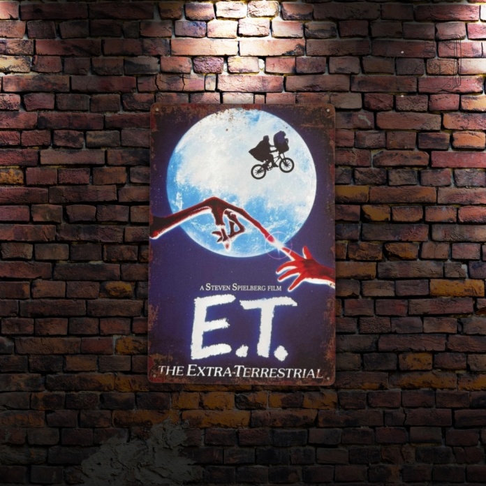 Tablica ozdobna z motywem filmu E.T. to wyjątkowa dekoracja dla miłośników klasyki kina i magii lat 80. Wykonana z trwałej blachy o wymiarach 20x30 cm, w stylu retro, wprowadzi do wnętrza ciepły, filmowy klimat.