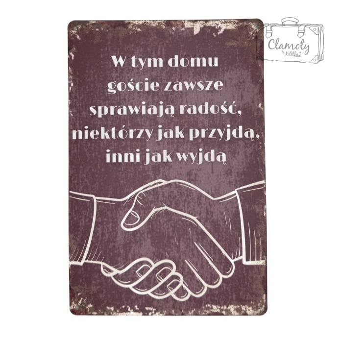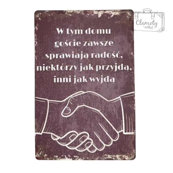 Tablica ozdobna W Tym Domu Goście Zawsze Sprawiają Radość to zabawna dekoracja w stylu retro, idealna do przedpokoju, kuchni lub salonu. Wykonana z trwałej blachy, wyróżnia się humorystycznym napisem i stylowym, vintage charakterem.